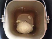 3.面包桶内依次放入牛奶、蛋液,对角放糖和盐,再放奶粉、面粉,在面粉顶端放入酵母。启动面包机的和面程序15分钟。