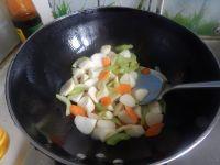 4.锅里加入油加入焯过水的胡萝卜及西芹炒匀