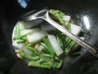 2.烧锅倒油烧热,下入切好的冬瓜和已摘洗好的带豆翻炒翻炒。