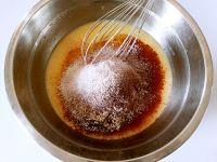 1.蛋黄中加入玉米油和牛奶。