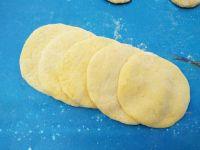 5.将剂子搓成球,压扁,擀成跟饺子皮大小差不多,稍厚一点儿的面皮。
