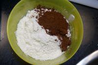 1.先来制作巧克力酥皮部分:把低筋面粉和可可粉一起称入碗中;
