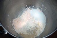 2.将高筋面粉、低筋面粉、吉士粉、奶粉、酵母、细糖,放置搅拌缸内,慢速混合均匀;