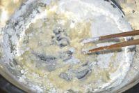 4.将15g的黄油熔化,加入50g的低筋面粉,再加入25g煮苹果片的汤汁和成面团;