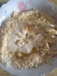 1.把面粉,白糖,泡打粉放到碗里,加入软化的黄油搓成玉米粉状。